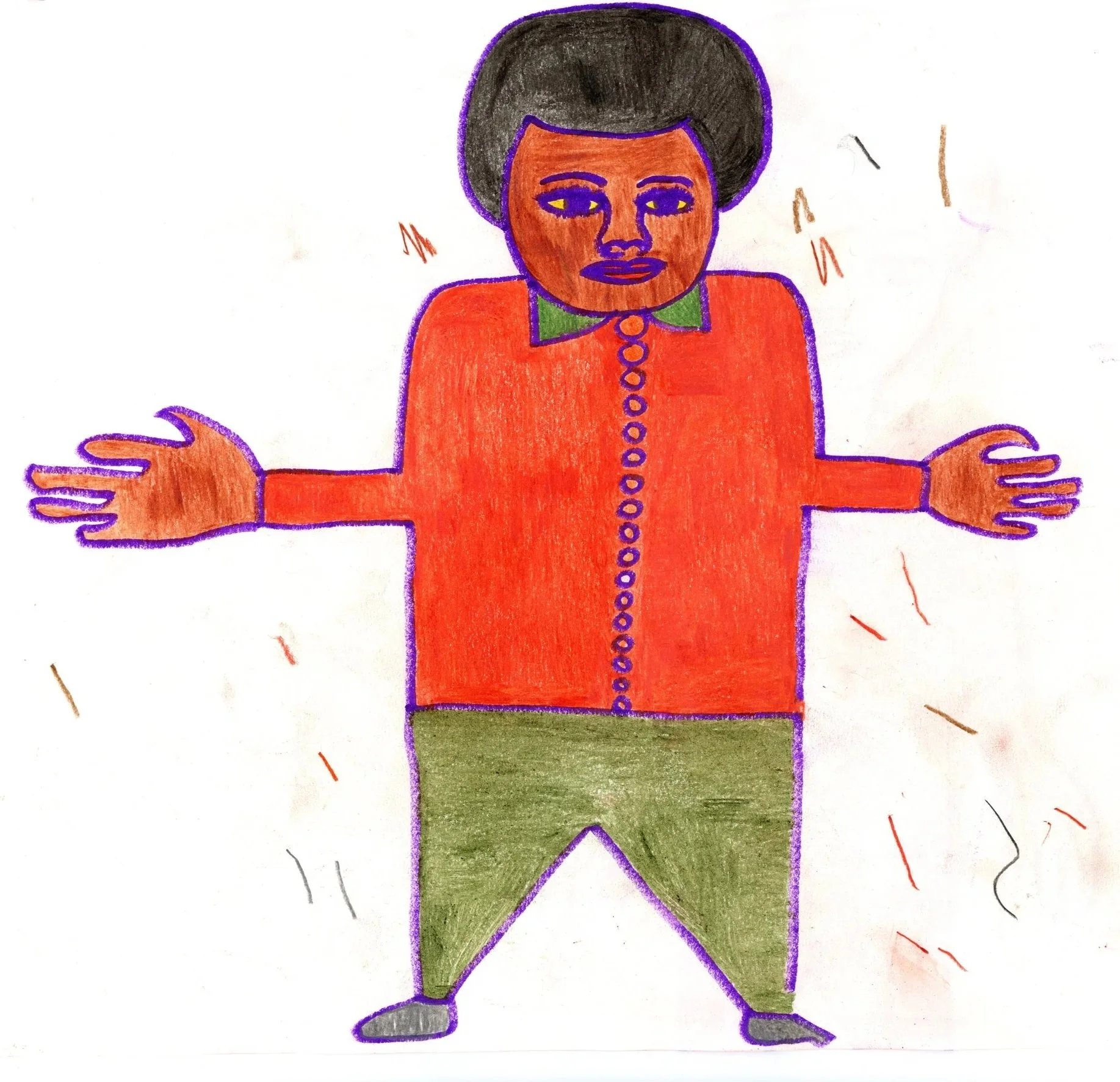 Mike Davis is an illustrator and mixed media artist represented by Fresh Eye Arts, a progressive studio supporting artists with disabilities in the twin cities metro area. Mike’s work focuses on portraits of Black figures, usually depicted standing in a distinct pose, facing forward with open arms. These figures are often repeated, but always unique. Details life outfit design, ear shape, skin color, and hairstyle distinguish each individual even as they’re part of a clearly developed iconography.