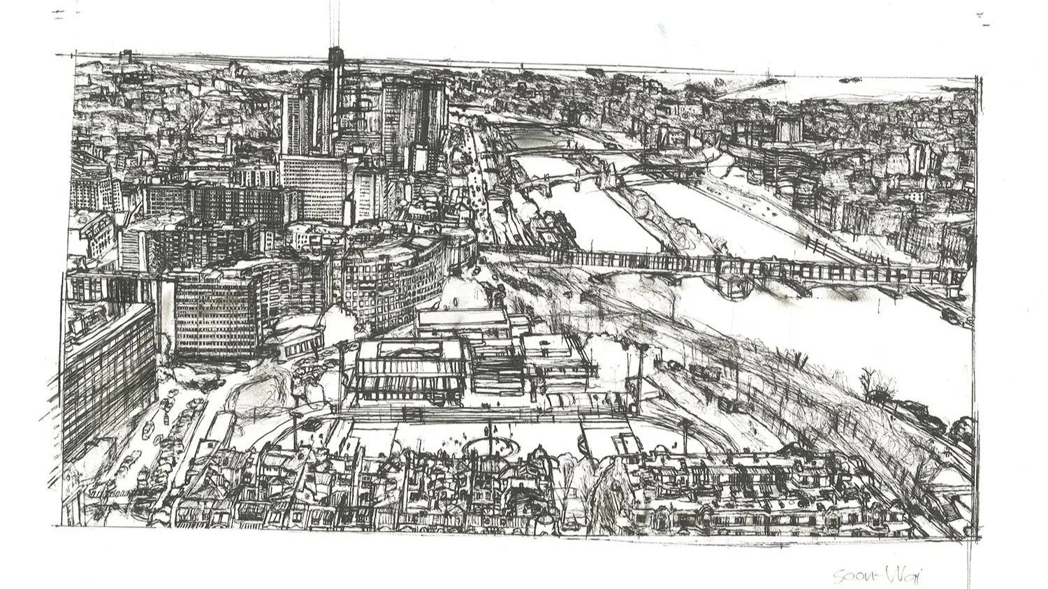Working from personal travel photography, Soon-Wai Wong creates expressive, detailed linework portraits of places and landscapes. His method of observing perspective is self-taught and intuitive. Soon-Wai's studio practice started in 2016 with small illustrations of his favorite subjects: classic cars and cityscapes. Over time, these works have grown in complexity and scale. Soon-Wai’s primary subject matter is architecture, with people in positions of transience, moving in and out of focus.